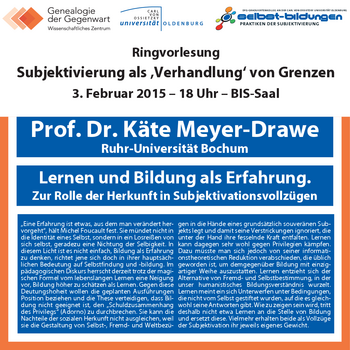 Vortrag "Lernen und Bildung als Erfahrung. Zur Rolle der Herkunft in Subjektivationsvollzügen" von Prof. Dr. Käte Meyer-Drawe im Rahmen der Ringvorlesung "Subjektivierung als 'Verhandlung' von [...]