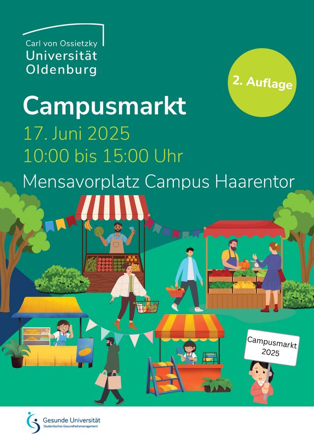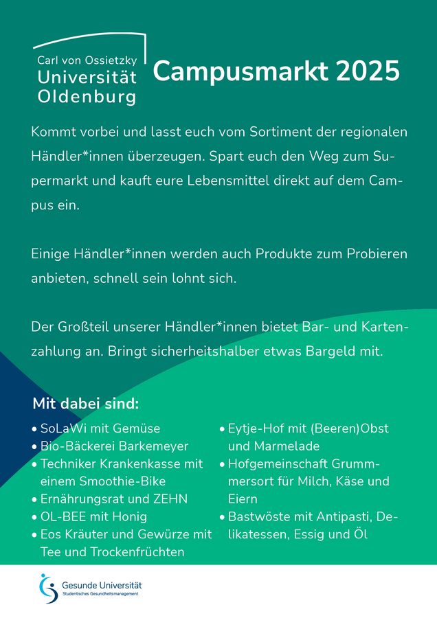 Die Erstauflage des Campusmarktes war im Sommersemester 2024. Kommt vorbei und lasst euch vom Sortiment der regionalen Händler*innen überzeugen. Spart euch den Weg zum Supermarkt und kauft eure Lebensmittel direkt auf dem Campus ein. Ihr könnte in lockerer Atmosphäre über den Markt schlendern, mit den Händler*innen ins Gespräch kommen und auch einige Getränke und Lebensmittel probieren.
