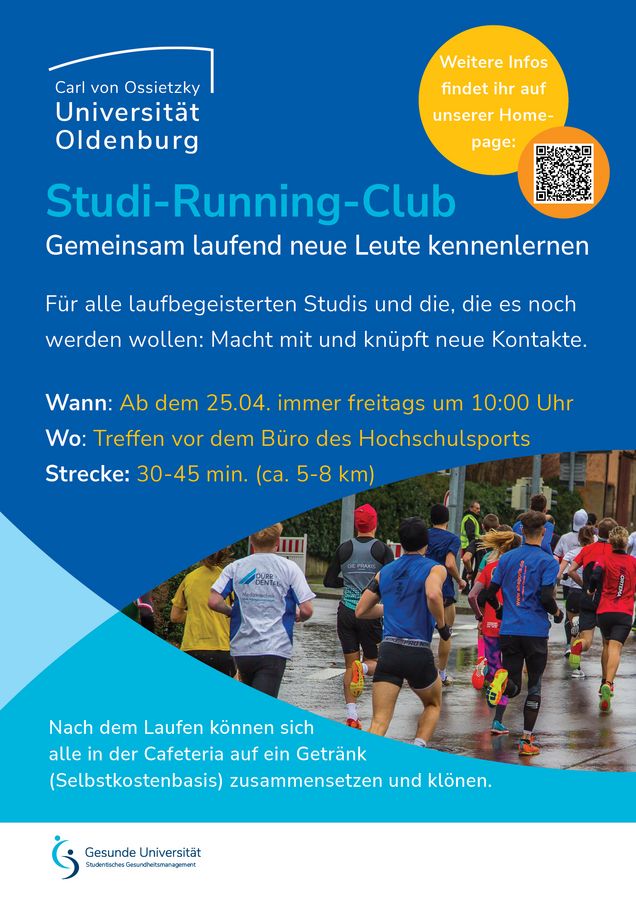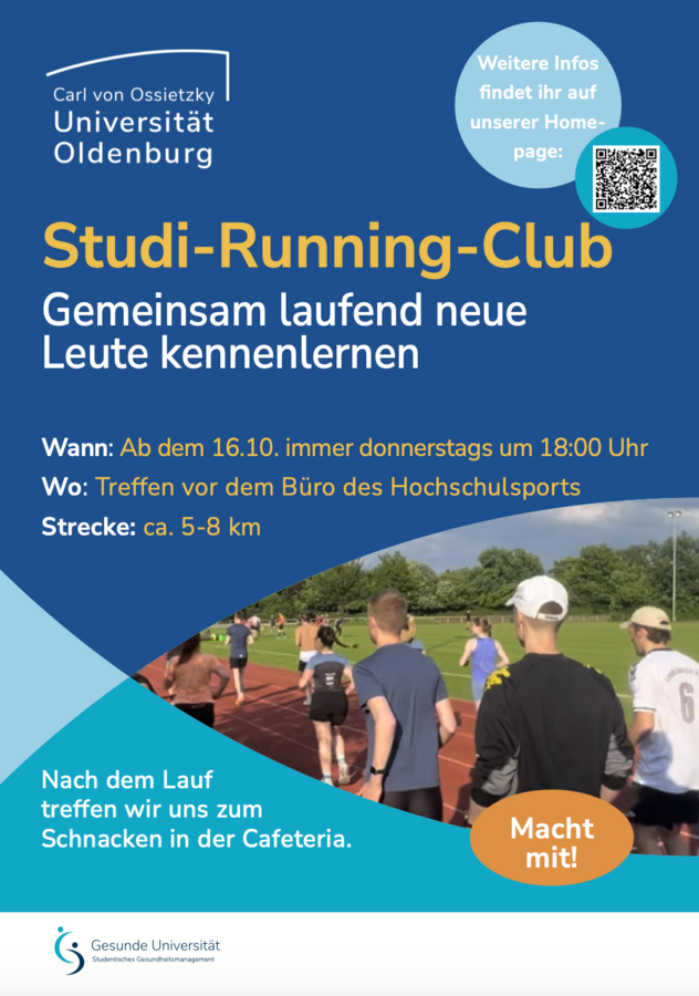 Unser Studi-Running Club richtet sich an alle laufbegeisterten Studierende. Kommt vorbei und seid ab dem 16.10.2025 bei unserem Running-Club für Studierende dabei. Wir treffen uns jeden Donnerstag um 18:00 Uhr vor dem Büro des Hochschulsports und laufen zwischen fünf und acht Kilometern. Während des Laufs könnt ihr euch besser kennenlernen und im Anschluss in der Cafeteria austauschen. Wir freuen uns auf euch!