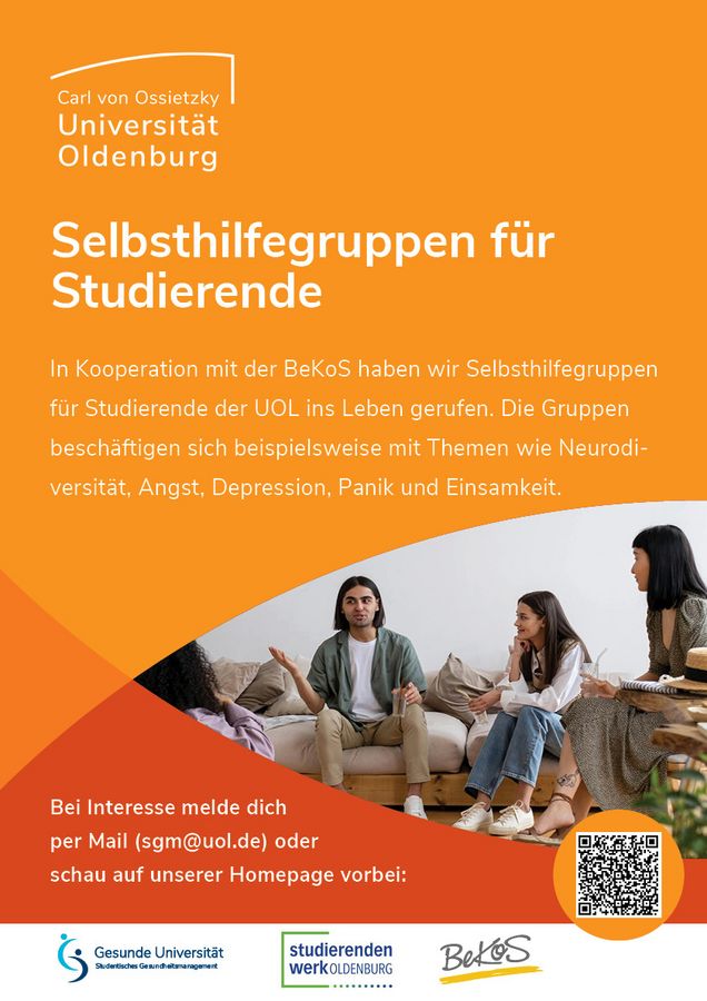 In Kooperation mit dem Psychologischen Beratungsservice (PBS) und der Beratungs- und Koordinationsstelle für Selbsthilfegruppen e. V. (BeKoS) haben wir Selbsthilfegruppen für Studierende der UOL ins Leben gerufen. Die Gruppen beschäftigen sich beispielsweise mit Themen wie Neurodiversität, Angst, Depression, Panik und Einsamkeit.