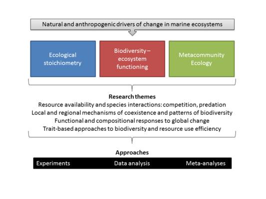Eine Prämisse unserer Arbeit ist die Tatsache, dass natürliche und anthropogene Variation in (u.a.) Nährstoffverfügbarkeit, Licht, Temperatur, Konnektivität und pH zu zeitlicher und räumlicher Variation in Populationen, Interaktionen, Biodiversität und Ressourcennutzung führt. Daher ist unsere Forschung in generelle ökologische Konzepte eingebettet, die uns Vorhersagen erlauben, wie Arten und Artwechselwirkungen auf diesen Wandel reagieren und welche Konsequenzen für Ökosystemprozesse diese Reaktionen hervorbringen. Konsumenten-Ressourcen Interaktionen analysieren wir im Zusammenhang der Ökologischen Stöchiometrie, die ökologische Phänomene auf verschiedenen Skalen erklärt anhand des organismischen Bedarfes an multiplen Ressourcen und der Verfügbarkeit in der Umwelt oder in der Nahrung. Die ökologische Stöchiometrie macht Vorhersagen von der intrazellulären chemischen Zusammensetzung von Zellen bis zu Eigenschaften und Prozessen von Ökosystemen. Räumliche Dynamiken analysieren wir im Kontext der Metagemeinschaftsökologie, wobei eine Metagemeinschaft aus verschiedenen Habitaten besteht, die durch Dispersion miteinander verbunden sind. Lokale Dynamiken in einem Habitat sind damit abhängig von dem Transport der interagierenden Arten zwischen den Habitaten. Sowohl Konsumenten-Ressourcen Interaktionen als auch räumliche Prozesse führen zu Biodiversitätsmustern, die wir im Rahmen von Biodiversität und Ökosystemfunktion analysieren. Hierbei hängt die Effizienz der Ressourcenaufnahme und ihrer Verwertung für den Biomasseaufbau ab von der Komplementarität und Plastizität von Arteigenschaften ("traits") in einer Lebensgemeinschaft.