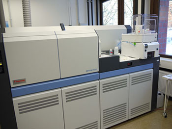 Für die hochpräzise Messung von Isotopenverhältnissen von Spurenelementen steht der Max-Planck Forschungsgruppe für Marine Isotopengeochemie am ICBM ein ThermoScientific Neptune Plus Multi-Kollektor-Massenspektrometer mit induktiv gekoppeltem Plasma (MC-ICP-MS) zur Verfügung, das mit insgesamt 9 Faraday-Detektoren (8 davon beweglich) und einem Secondary Electron Multiplier (SEM) für die Messung sehr niedriger Signalintensitäten ausgestattet ist.