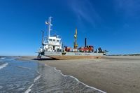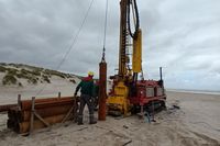 In zwei separaten Aktionen wurden drei Grundwassermessstellenbündel am DynaDeep-Untersuchungstransekt errichtet. Ende Mai 2022 wurden zwei Messstellenbündel am Dünenfuß sowie an der Hochwasserlinie installiert. Im August 2022 folgte dann die Errichtung des dritten Messstellenbündels an der Mittelwasserlinie. Hierbei kam ein Bohrgerät der Firma Harms auf einem Schiff zum Einsatz.