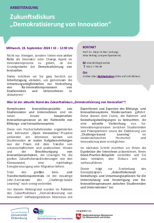 Die virtuelle Arbeitstagung des Zukunftsdiskurs "Demokratisierung von Innovation" hat am 18. September 2024 zwischen 10:00 und 12:30 Uhr stattgefunden. Diese stellt einen wichtigen Meilenstein im Projekt "Demokratisierung von Innovation" dar und hatte zum Ziel, erste Ergebnisse der Befragung von Expertinnen und Experten aus dem Bildungs- und Innovationssystem Niedersachsens vorzustellen und mit Vertreterinnen und Vertretern aus den Bereichen Lehre, Transfer und der Wirtschaft zu diskutieren. Dieser Austausch trägt zur Erarbeitung des Konzeptpapiers „Zukunftskonzept - Gestaltungs- und Umsetzungsoptionen für die Unterstützung und Verstetigung von Ko-Innovationsprozessen zwischen Studierenden und Unternehmen“ bei.