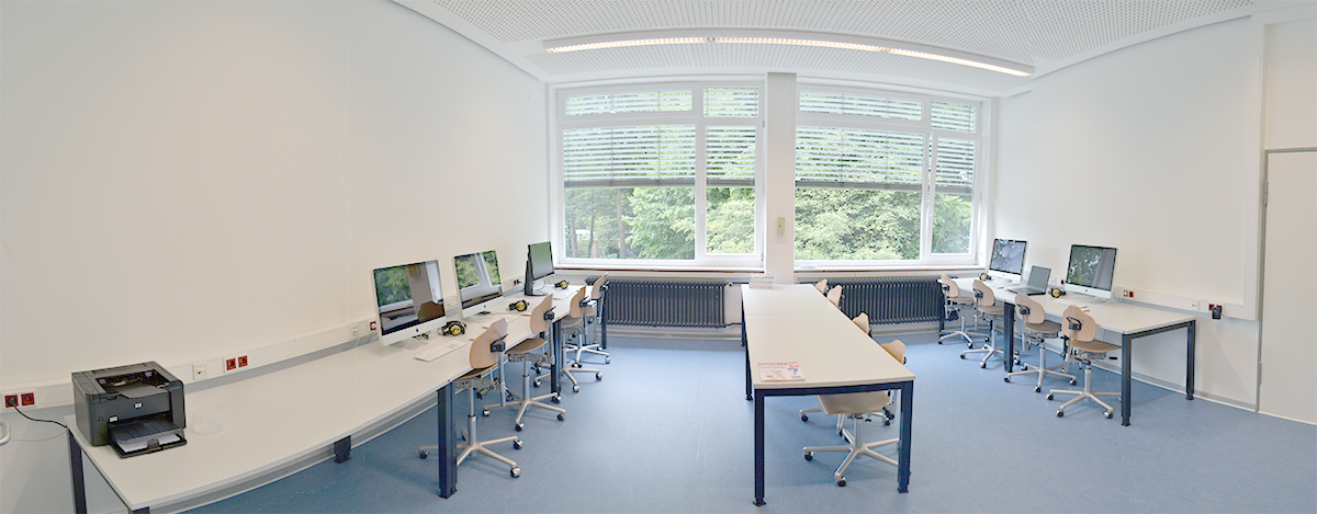 Im Lehr-Lern-Angebot stehen Arbeitsplätze mit aktueller Software für Gestaltungs-, Recherche- und Dokumentationspraxis zur Verfügung, die audiovisuelle Medien- sowie Internetforschung ermöglichen.