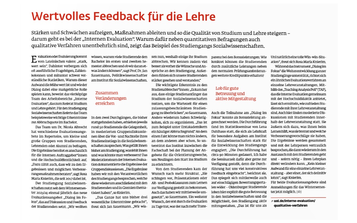Neben den quantitativen Verfahren der Internen Evaluation, zu denen die Befragungen sowie die Lehrveranstaltungsevaluation gehören, bietet die Interne Evaluation zwei qualitative Verfahren an: