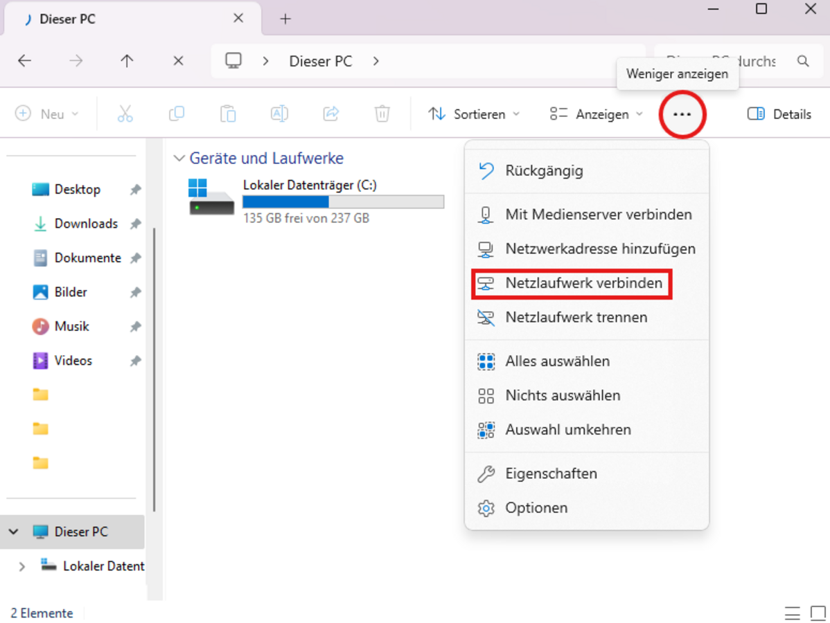 Schritt 5: Um das Home-Laufwerk oder einen darin enthaltenen Ordner zu den Favoriten Ihres Dateiexplorers hinzuzufügen, öffnen Sie diesen und klicken auf die Schaltfläche mit den drei Punkten neben dem aktuell geöffneten Pfad (siehe folgende Abbildung).