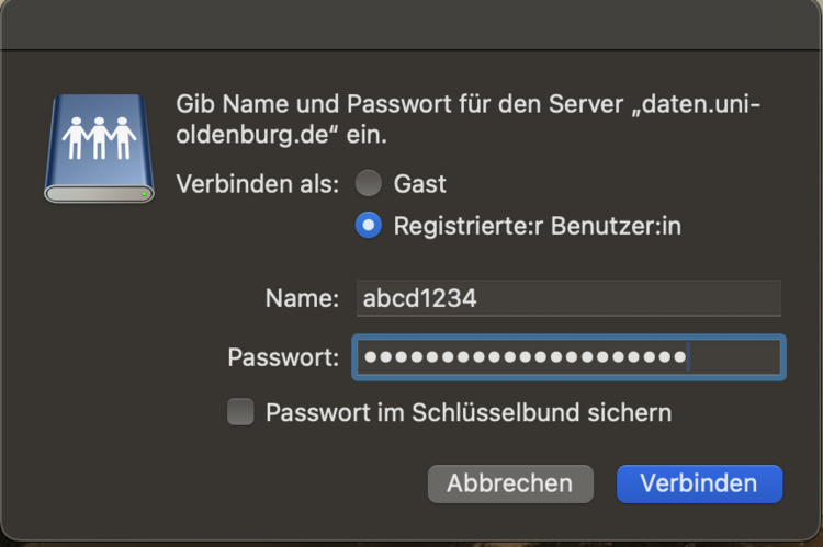 Schritt 3: Sollte Ihr System die Zugangsdaten nicht bereits kennen, sollten Sie folgendes Dialogfenster zur Abfrage dieser Daten angezeigt bekommen. Entsprechend der folgenden Abbildung müssen Sie dort als Name Ihr Kürzel (bspw. abcd1234) verwenden. Anschließend drücken Sie zum Bestätigen auf „Verbinden”.