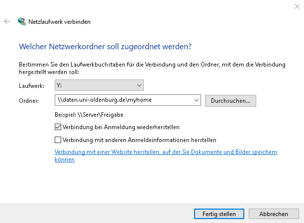 Schritt 3: In dem sich nun geöffneten Dialogfenster „Netzlaufwerk verbinden“ wählen Sie einen freien Buchstaben nach Ihrem belieben aus (z.B. Z:) oder belassen es bei der Vorauswahl. In dem Feld neben „Ordner:” geben Sie \\daten.uni-oldenburg.de\myhome an und klicken anschließend auf "Fertig stellen" (siehe folgende Abbildung). Das setzen des Häkchens zur Wiederherstellung der Verbindung bei Anmeldung bedingt, dass Ihr System die Zugangsdaten kennt.