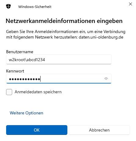 Schritt 4: Sollte Ihr System die Zugangsdaten nicht bereits kennen, sollten Sie folgendes Dialogfenster zur Abfrage dieser Daten angezeigt bekommen. Entsprechend der folgenden Abbildung müssen Sie dort als Benutzername w2kroot\ gefolgt von Ihrem Kürzel (bspw. abcd1234) verwenden. Anschließend drücken Sie zum Bestätigen auf „Ok”.