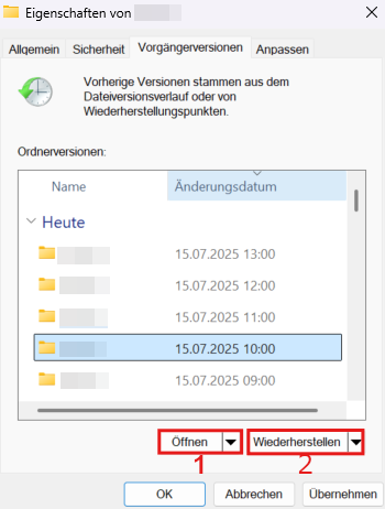 Schritt 3: In dem Reiter „Vorgängerversionen” können Sie selbständig aus den vorhandenen Sicherungen des Ordners auswählen. Nach einer entsprechenden Auswahl haben Sie die Möglichkeit durch das Klicken auf „Öffnen” (Markierung Nr. 1 in der folgenden Abbildung) eine Vorgängerversion des Ordners zu öffnen oder durch das Klicken auf „Wiederherstellen” (Markierung Nr. 2) den gesamten Ordner zu dem ausgewählten Zeitpunkt wiederherzustellen.