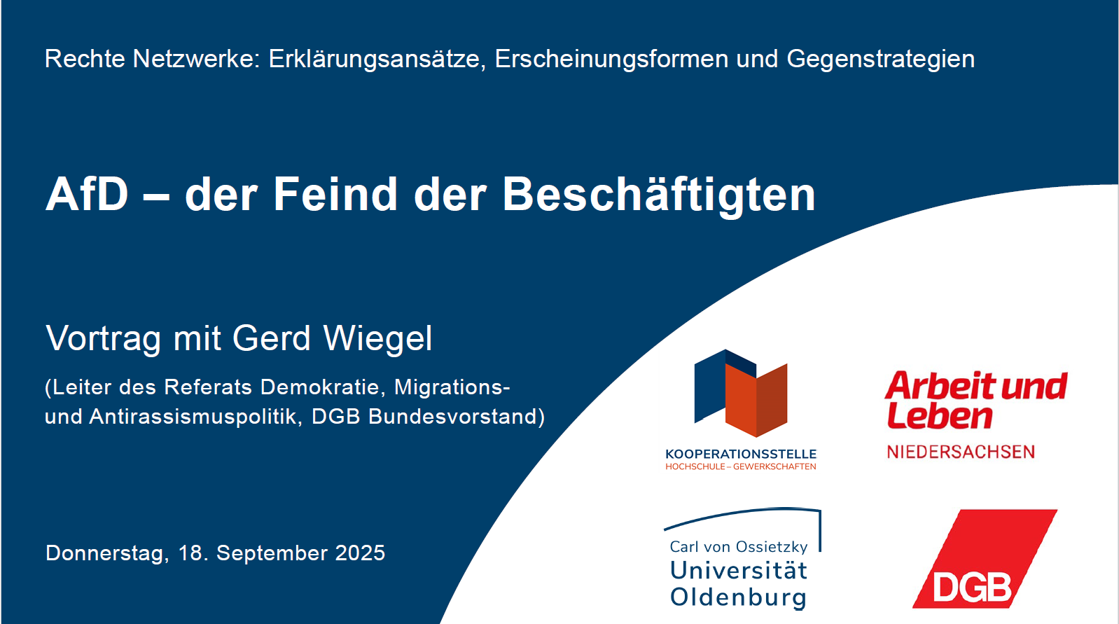 Der Vortrag fand im Rahmen der Veranstaltungsreihe „Rechte Netzwerke: Erscheinungsformen, Erklärungsansätze und Gegenstrategien” statt und wurde in Zusammenarbeit mit Arbeit und Leben Niedersachsen sowie dem DGB Oldenburg-Ostfriesland durchgeführt.