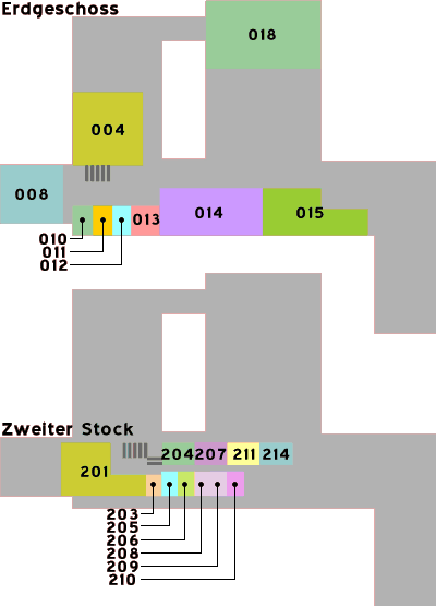| Erdgeschoss 001 - Seminar 003 - Holzwerkstatt 004 - Gast 005 - freiraum 006 - Werkstattbüro Wallach 007 - Hochdruck 008 - Buchdruck 009 - Siebdruck 010 - Praxisarbeitsraum 011 - Hochdruck 012/14 - Reprotechnik 015/18 - Fotolabor | Erster Stock |