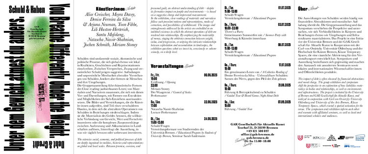Wie Schulden auf Körper, Organismen, Beziehungen und Gefühle sowie die Umwelt und Infrastrukturen einwirken, wird oft von finanzpolitischen Abstraktionen und moralischer Aufladung überdeckt. Das Symposium und die Gruppenausstellung verlagern die Perspektive darauf, wie sich Verbindlichkeiten in Geschichten, Erinnerungen, Identitäten und Umgebungen einschreiben und beständig neu formieren.