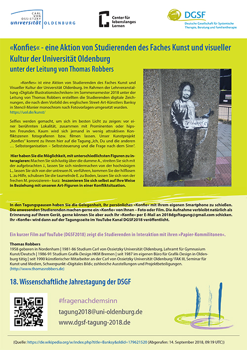 In den Tagungspausen haben Sie die Gelegenheit, Ihr persönliches »Konfie« mit Ihrem eigenen Smartphone zu schießen. Die anwesenden Studierenden machen gerne ein »Konfie« von Ihnen – Foto oder Film. Die Aufnahme verbleibt natürlich als Erinnerung auf Ihrem Gerät, gerne können Sie aber auch Ihr »Konfie« per E-Mail an 2018dgsftagung@gmail.com schicken. Ihr »Konfie« wird dann auf der Tagungsseite im YouTube Kanal DGSF2018 veröffentlicht.