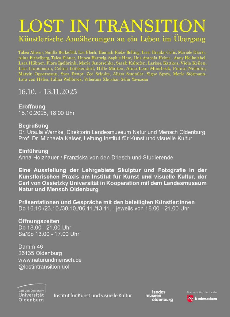 „Lost in Transition" ist ein Ausstellungsprojekt der Lehrgebiete Skulptur und Fotografie der künstlerischen Praxis am Institut für Kunst und visuelle Kultur, der Carl von Ossietzky Universität in Kooperation mit dem Landesmuseum Natur und Mensch Oldenburg.