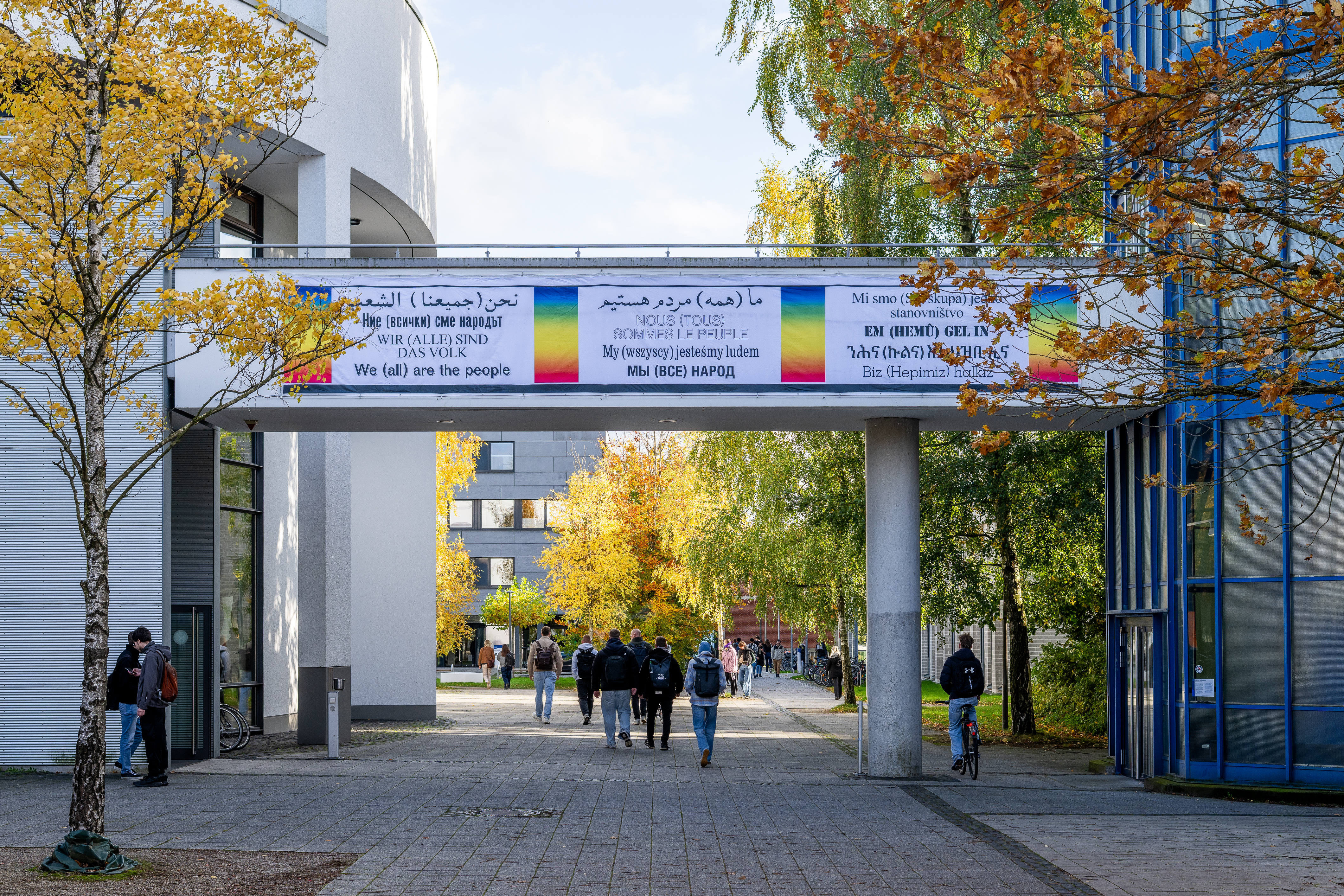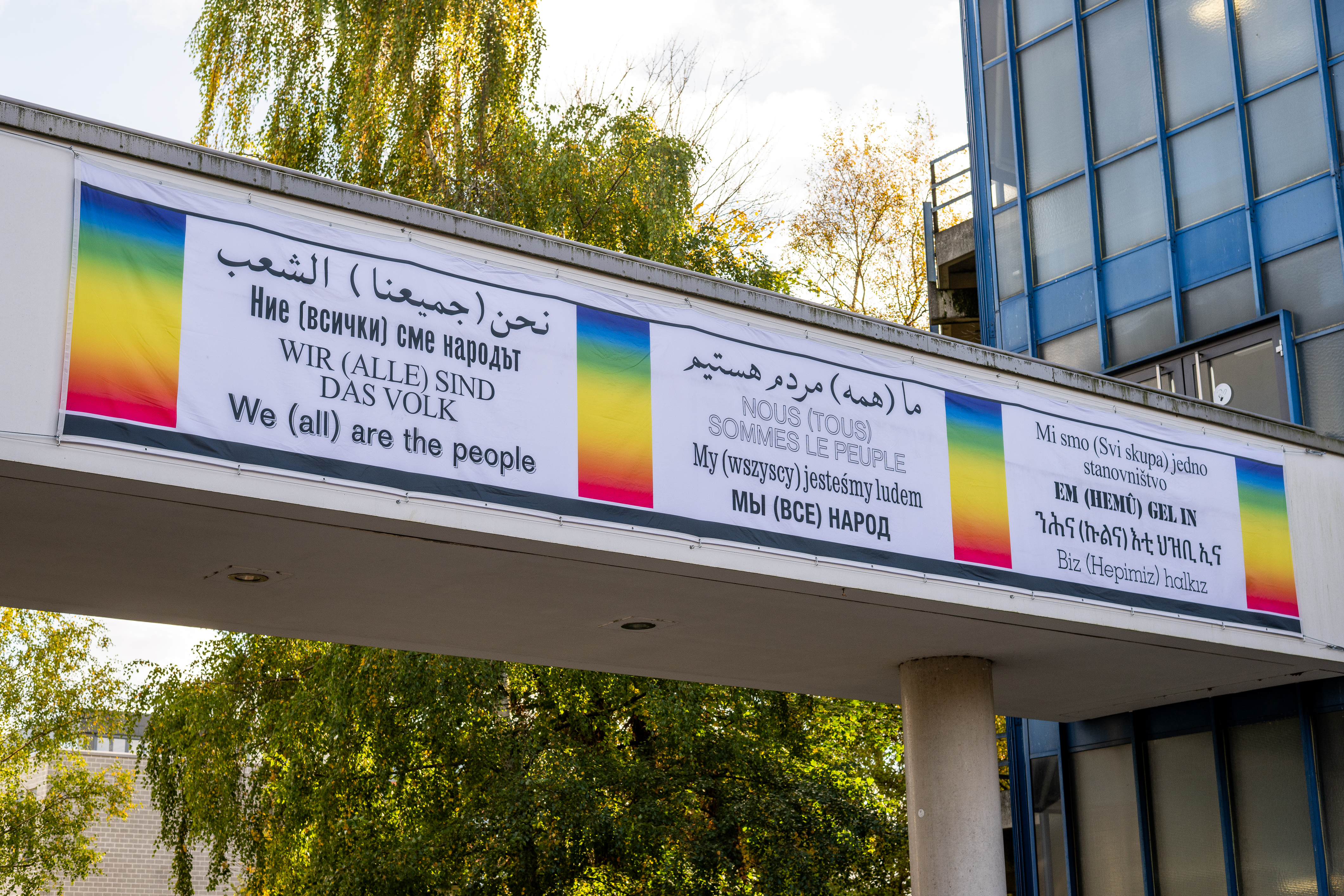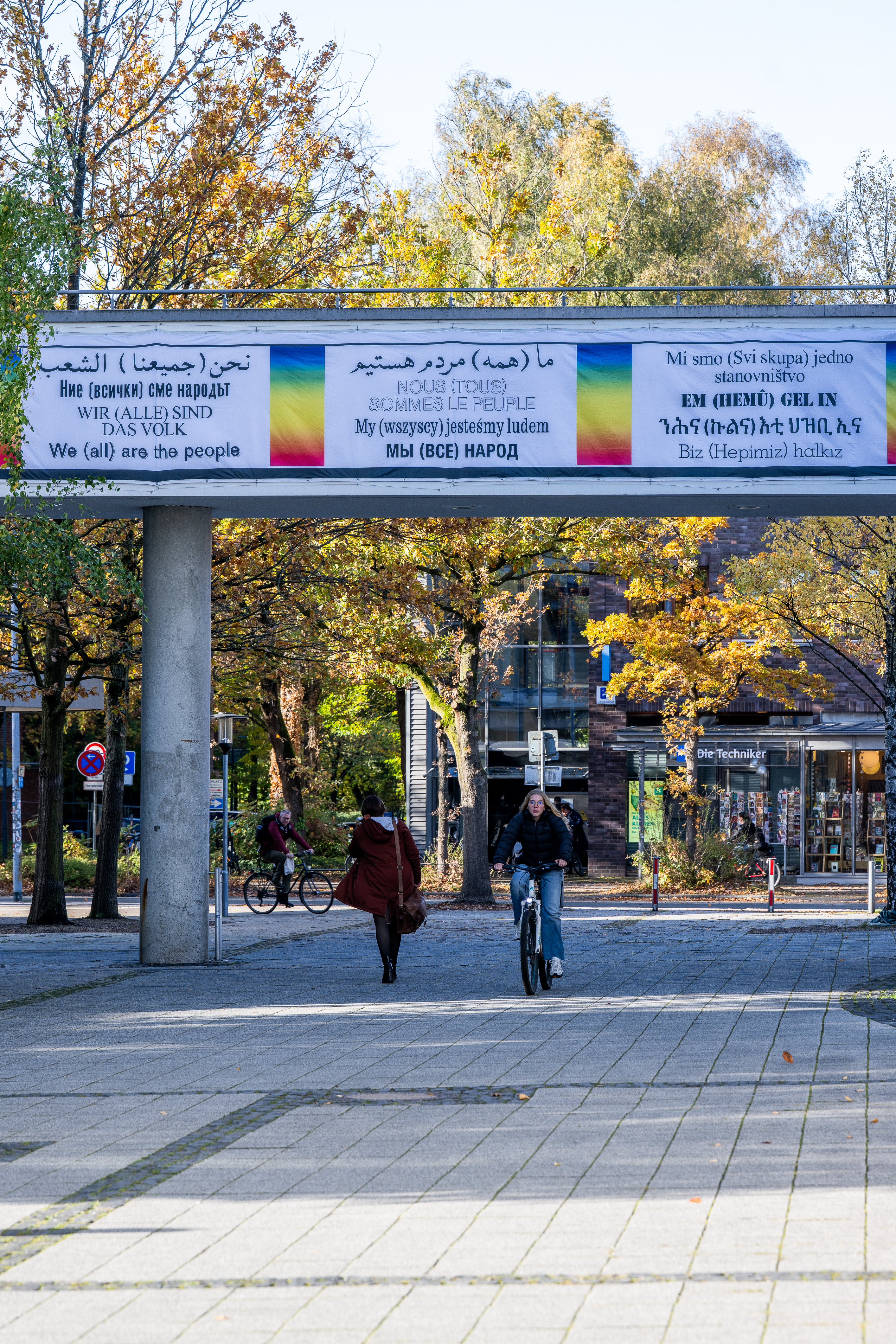 Seit Herbst 2025 befinden sich an der Brücke zwischen den Gebäuden A1 und A14 zwei Banner der Serie Wir (alle) sind das Volk des Künstlers Hans Haacke. Auf je 10 x 1,5 Meter großen Bahnen ist in insgesamt zwölf Sprachen der Titel des Werkes zu lesen, der jeweils links und rechts von Farbblöcken mit Regenbogenverlauf gerahmt wird. Die Sprachen – Arabisch, Bulgarisch, Deutsch, Englisch, Farsi, Französisch, Polnisch, Russisch, Kroatisch, Kurdisch, Tigrinya und Türkisch – bilden jene Herkunftsländer ab, aus denen die meisten Migrant*innen in Deutschland zum Zeitpunkt der ersten Präsentation des Werkes auf der documenta 14 (2017) stammten.[i] Auf den Bannern sind die einzelnen Übersetzungen in drei Blöcken und – wertungsfrei – in ihrer alphabetischen Reihenfolge sortiert.