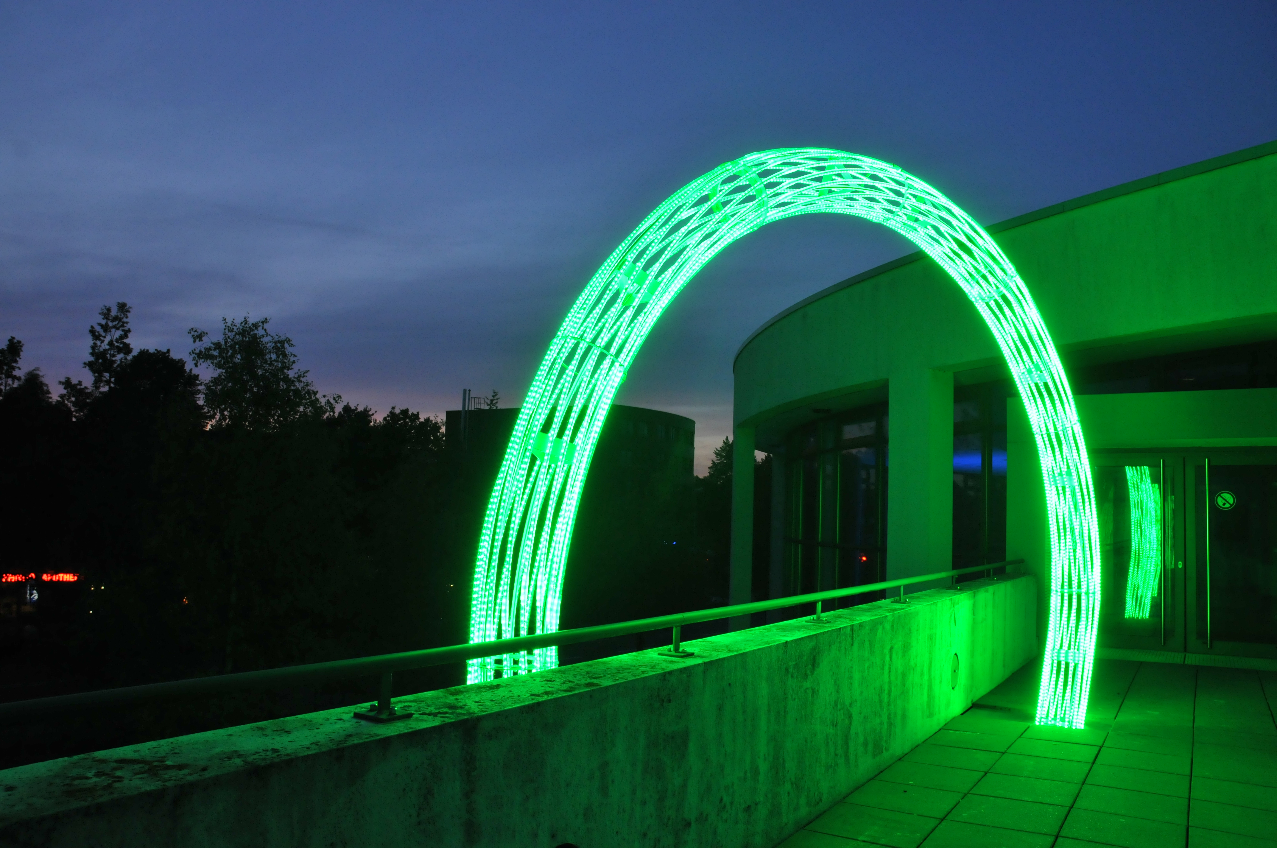 Ganz neu ist die Nutzung der Brücke für künstlerische Arbeiten, besonders für solche, die sich mit gesellschaftlichem Zusammenleben und Politik auseinandersetzen, nicht. Im Rahmen einer Ausstellung zum 125. Geburtstag des Philosophen Karl Jaspers in 2008 entwarfen Peter Weibel und Ólafur Elíasson das Werk Rainbow Democracy, einen Ring, der in den Farben des Parteienspektrums leuchtete. Peter Weibel schrieb dazu im ausstellungsbegleitenden Katalog: „Der Farbkreis um die Brücke zwischen zwei Universitätsgebäuden spielt auf die Brückenfunktion des Parlaments an und auf eine Demokratie, in der alle Interessensgruppen gerecht vertreten sind, also alle verfassungstreuen republikanischen Parteien.“[iv] Auf einer Wiese auf dem Campus Haarentor installierten Weibel und Elíasson zudem einen Wassersprenkler, der einen ringförmigen Streifen Rasen bewässerte. Die Künstler griffen in dieser Arbeit die Notwendigkeit der Partizipation an politischen Prozessen auf: „Daher ist auf einer Wiese in größerer Entfernung ein Wassersprenkler angebracht, der ebenfalls einen Kreis mit Wasser besprüht. Dort, wo das Wasser hinfällt, ist die Wiese grün. Dort, wo das Wasser nicht hinfällt, ist die Wiese braun. Demokratie muss ausgeführt und aktiviert werden. Demokratie ist grün. Dort, wo keine Demokratie herrscht, wo kein Wasser aktiviert wird, herrscht das Braun der Diktatur.“[v]