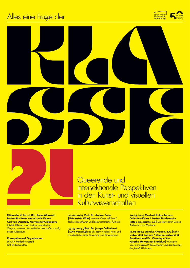 Das Thema soziale Klasse ist aufgrund gesellschaftlicher Konflikte, Spaltungen und Heraus forderungen gegenwärtig sehr virulent. Klasse, Klassenverhältnisse und Klassismus erfahren in queer/enden Kontexten dabei oft eine besondere Zuspitzung ebenso wie in zahlreichen an deren Konstellationen. Von daher gilt es, Klassenfragen per se intersektional aufzufassen, sind diese doch aufs engste verknüpft mit Fragen von gender und race, von Befähigung, Religion und Alter – um nur einige Diskriminierungsparameter zu nennen. [...] Aus der Perspektive der Kunst- und visuellen Kulturwissenschaften stehen in der Vor tragsreihe sowohl wissenschaftspolitische, -historische und -theoretische Herangehensweisen als auch konkrete Analysen von audiovisuellen künstlerischen Arbeiten, die Klassenfragen aus- und verhandeln und (nicht nur das Anthropozän, sondern auch) das Kapitalozän mikro politisch thematisieren. Welche Argumentationen werden auf welche ästhetisch-mediale Art und Weise zur Diskussion gestellt? [...] Vorgestellt und diskutiert werden aktuelle Positionen aus den Kunst-, visuellen Kultur- und Medienwissenschaften, um eine neue Per spektive auf die Kategorie Klasse in queerender intersektionaler Verschränkung zu gewinnen.