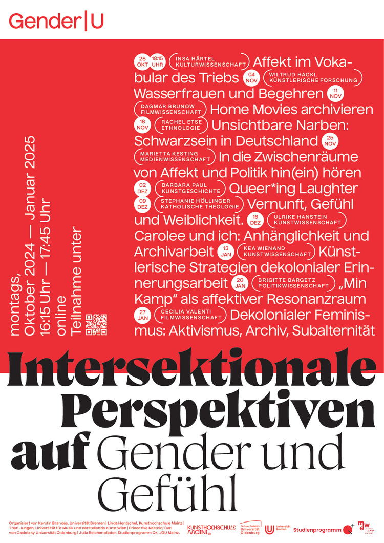 Im Wintersemester 2024/25 veranstalten das Institut für Kunst und visuelle Kultur (JProf. Dr. Friederike Nastold), das Studienprogramm Q+ der JGU Mainz und die Kunsthochschule Mainz gemeinsam mit der Universität Bremen und der Kunstuniversität Linz erstmals eine internationale, interdisziplinäre Ringvorlesung. Es sind Beiträge zur Genderforschung versammelt, die einen Fokus auf Gefühl, Affekt und Emotion legen.