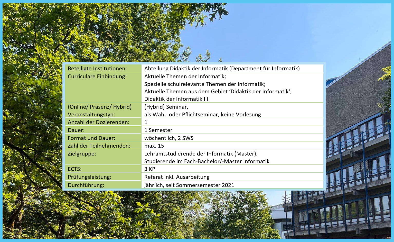 Dieses Lehrkonzept verfolgt das Ziel, Studierende auf einen gendersensiblen Umgang mit Schüler/-innen im Informatikunterricht und darüber hinaus vorzubereiten. Dazu werden theoretische Grundlagen besprochen und darauf aufbauend ein eigenes Projekt konzipiert und umgesetzt. Das Seminar besteht aus zwei Teilen: den theoretischen Grundlagen des Gebiets, einschließlich aktueller Forschung, sowie der eigenen praktischen Arbeit an einem (gemeinsamen) Projekt.