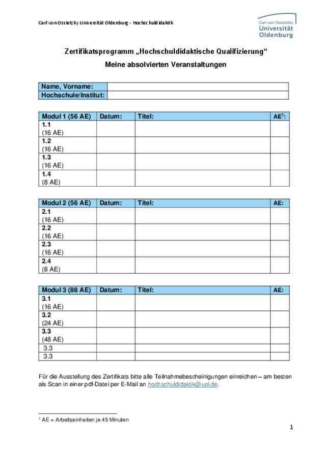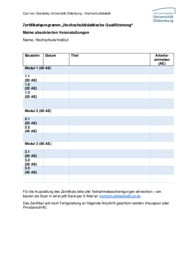Nachfolgend finden Sie das Angebot über hochschuldidaktische Veranstaltungen für das Zertifikatsprogramm "Hochschuldidaktische Qualifizierung" an der Universität Oldenburg.
