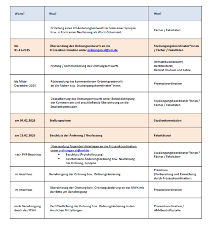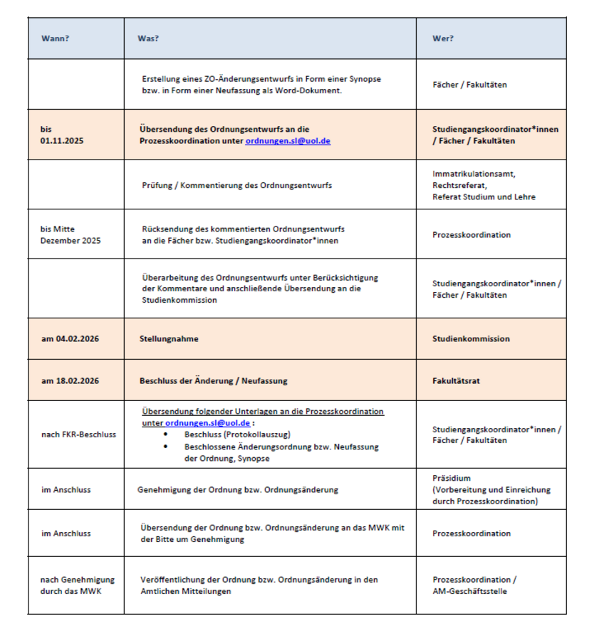 Der im Folgenden abgebildete Prozessplan bietet eine Übersicht der für die Fakultäten wichtigsten Eckdaten und Fristen zur Änderung oder Neufassung einer Zugangs- bzw. Zulassungsordnung.