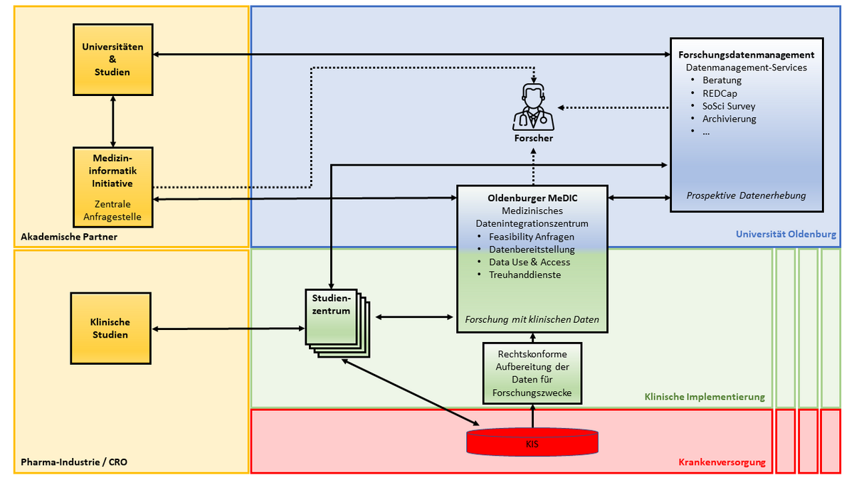 Seit 2023 wird an der Universitätsmedizin Oldenburg ein solches medizinisches Datenintegrationszentrum aufgebaut (MeDIC-UMO). Das lokale Hauptziel ist die Unterstützung von klinischer Forschung und Versorgung in Oldenburg durch eine vereinfachte und standardisierte Bereitstellung medizinischer Routinedaten. Darüber hinaus wird Oldenburg mit dem MeDIC-UMO an die organisatorischen und technischen Infrastrukturen des nationalen, forschungsbezogenen Austauschs von medizinischen Routinedaten angebunden. Gemeinsam mit den anderen DIZen und zentralen Komponenten wird eine bundesweite, interdisziplinäre, organisatorische und technische Struktur zur forschungsbezogenen Nutzung von klinischen Routinedaten aus der Patientenversorgung zur Verfügung gestellt. Diese Struktur ist produktiv und deckt die notwendigen Prozesse von der Beantragung bis zur Bereitstellung von Daten ab.