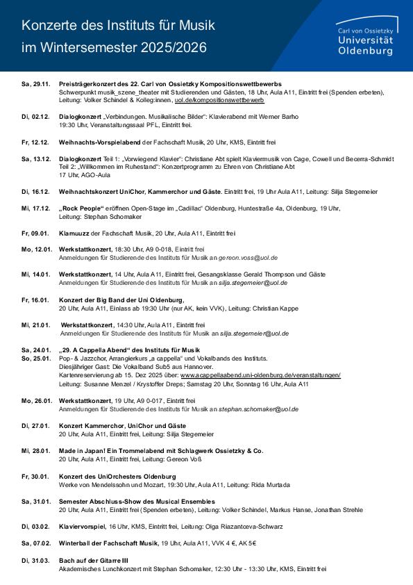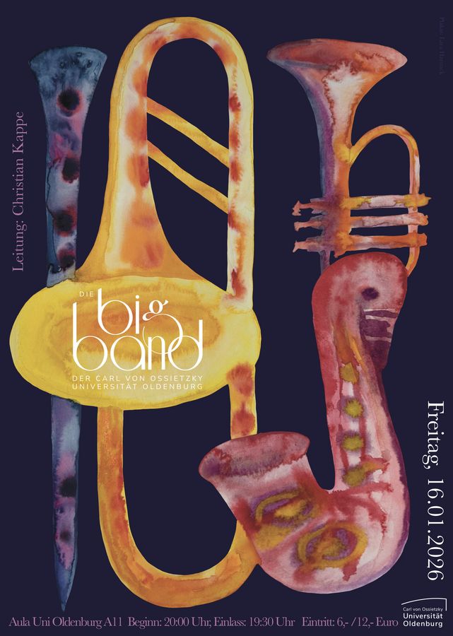 Swing, Modern Jazz und lateinamerikanische Musik erklingen am Freitag, 16.1.2026 an der Universität Oldenburg, wenn die Uni-Bigband wieder auf der Bühne steht. Das Abschlusskonzert zum Semesterende unter Leitung von Christian Kappe beginnt um 20.00 Uhr in der Uni-Aula (Einlass ab 19:30 Uhr, Gebäude A11, Ammerländer Heerstraße 69). Neben verschiedenen Klassikern zählen auch zeitgenössische Titel zum aktuellen Repertoire des Jazzorchesters. Sowohl Instrumental- als auch Gesangsstücke von u.a. Ethel Waters, Bob Mintzer, John Daversa, Pat Metheny, Diana Krall sowie der Gruppe Radiohead gehören zu den Highlights des Abends. Karten für 12 Euro (ermäßigt 6 Euro) sind ausschließlich an der Abendkasse erhältlich. Die Fachschaft Musik bietet im Foyer Getränke an.