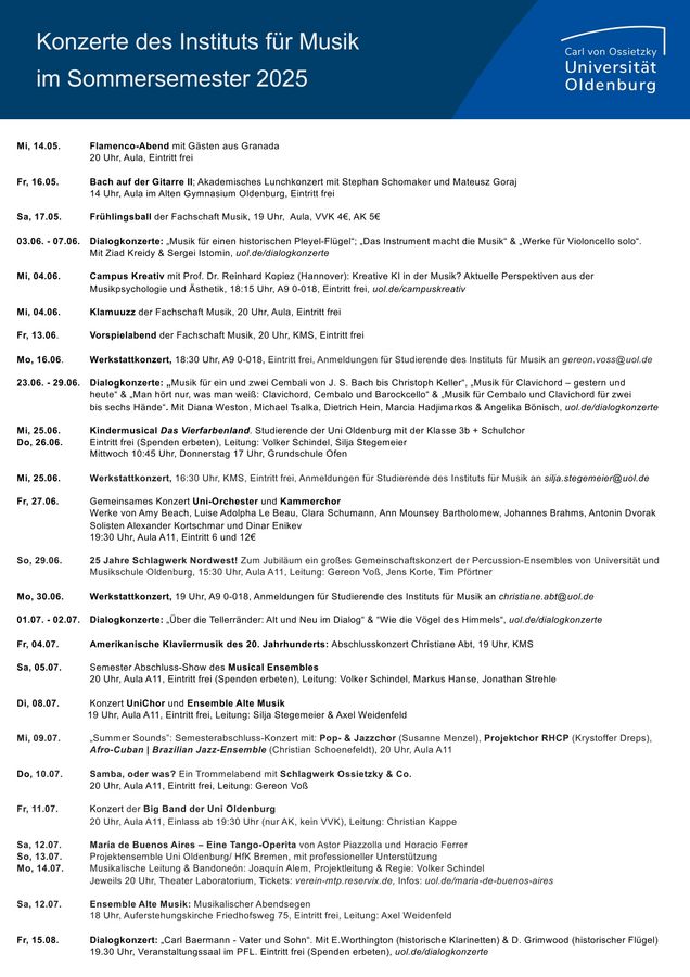 Verschaffen Sie sich einen Überblick unter folgendem Link: uol.de/musik/lehre/musikpraxis/ensembles