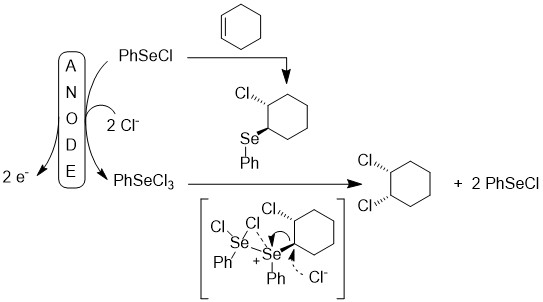 A recent example from our group is the electrochemical version of the cis-chlorination of alkenes mediated by selenium compounds.