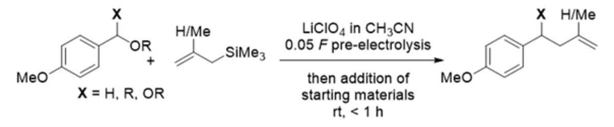 Pre-electrolysis of LiClO4 in Acetonitrile: Electrochemically Induced Protolytic Carbon–Carbon Bond Formation of Benzylic Ethers and Acetals with Allyl Trimethylsilane and Other Carbon Nucleophiles