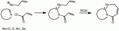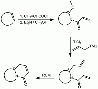 Auch neue Valerolactamstrukturen konnten auf einem ähnlichen Syntheseweg erhalten werden. Hierzu musste eine HOSOMI-SAKURAI-Reaktion als Zwischenschritt nach der Säurechloridaddition erfolgen, um Diene aus den Acrylamiden zu erhalten. Anschließend erfolgt auch hier eine Ringschlussmetathese.