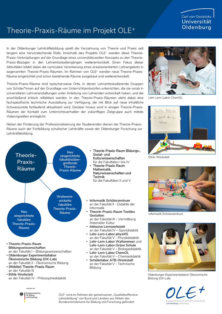 In der Oldenburger Lehrkräftebildung spielt die Verzahnung von Theorie und Praxis seit langem eine hervorstechende Rolle. Innerhalb des Projekts OLE+ werden diese Theorie-Praxis-Verknüpfungen auf der Grundlage eines universitätsweiten Konzepts zu den Theorie-Praxis-Bezügen in den Lehramtsstudiengängen weiterentwickelt. Einen Fokus dieser Aktivitäten bildet dabei die curriculare Verankerung eines praxisorientierten Lehrangebots in sogenannten Theorie-Praxis-Räumen. Theorie-Praxis-Räume sind typischerweise Orte, in denen Lehramtsstudierende Gruppen von Schülerinnen und Schülern auf der Grundlage von Unterrichtsentwürfen unterrichten, die sie vorab in universitären Lehrveranstaltungen unter Anleitung von Lehrenden entwickelt haben, und die anschließend kritisch reflektiert werden. In den Theorie-Praxis-Räumen steht dabei eine fachspezifische technische Ausstattung zur Verfügung, die mit Blick auf neue inhaltliche Schwerpunkte fortlaufend aktualisiert wird. Darüber hinaus wird in einigen Theorie-Praxis-Räumen der Kontakt zum Unterrichtsverhalten der zukünftigen Zielgruppe auch mittels Videovignetten ermöglicht. Den Schwerpunkt der videographierten Unterrichtssequenzen bilden dabei Videos, in denen inhaltliche Schwerpunkte der Lehramtsausbildung an der Universität Oldenburg aber auch typische Probleme des jeweiligen Fachunterrichts thematisiert werden. Neben der Förderung der Professionalisierung der Studierenden dienen die Theorie-Praxis-Räume auch der Fortbildung schulischer Lehrkräfte sowie der Oldenburger Forschung zur Lehrkräftebildung.