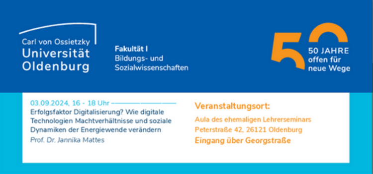 Prof. Dr. Jannika Mattes (Institut für Sozialwissenschaften): „Erfolgsfaktor Digitalisierung? Wie digitale Technologien Machtverhältnisse und soziale Dynamiken der Energiewende verändern“, Vortragsreihe der Bildungs- und Sozialwissenschaften mit 12 Veranstaltungen von Ende Mai bis Anfang Dezember in der Aula des einstigen Oldenburger Lehrerseminars (Peterstraße 42) 3. September, 16.00 Uhr