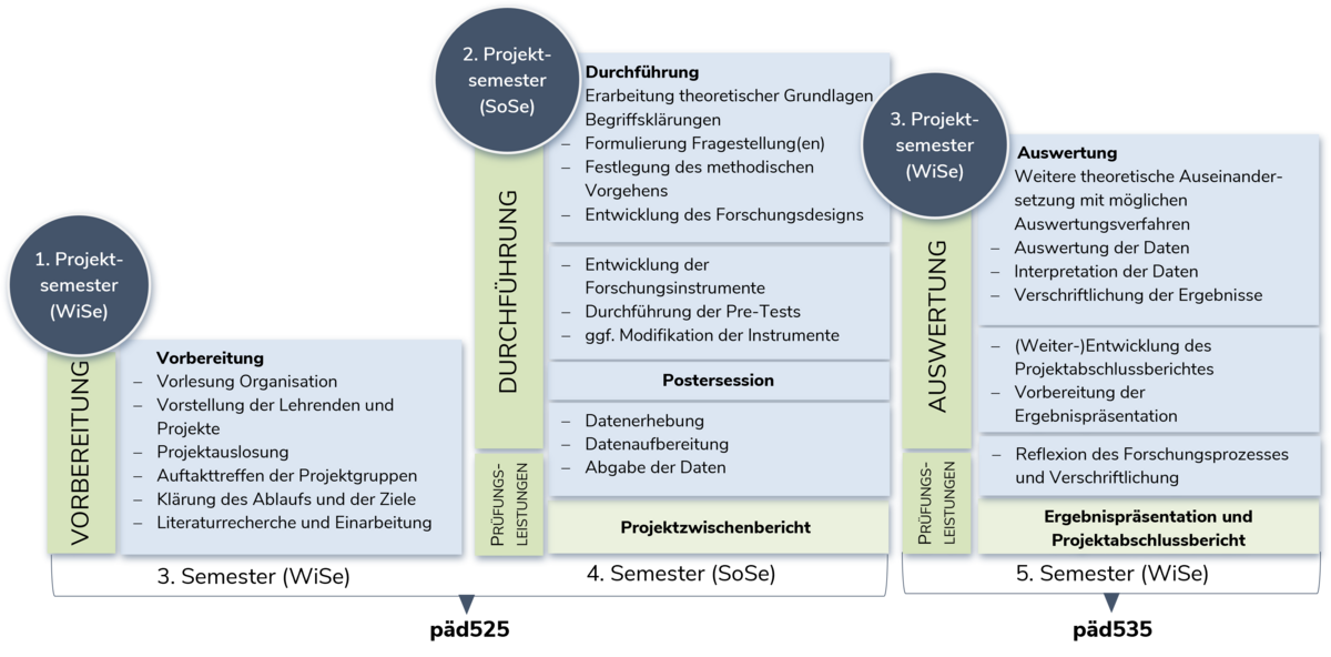 Im ersten Modul (päd525) findet in der zweiten Hälfte des ersten Wintersemesters zunächst die einführende Vorlesung zur Vorbereitung auf die Projektphase statt, hier werden Informationen zur Projektphase und den Prüfungsleistungen gegeben und es werden die beteiligten Lehrenden und deren Projektangebote vorgestellt. Daran anschließend folgt das Losverfahren für die Projekte. Nach der Bildung der Projektgruppen finden die Auftakttreffen der Projetgruppen statt, hier stehen die Klärung der Ziele und des Ablaufs der Projekte mit den Lehrenden im Fokus. Die Studierenden nehmen dann in den Semesterferien eine Literaturrecherche und inhaltliche Einarbeitung in das Forschungsthema ihres Projektthemas vor.