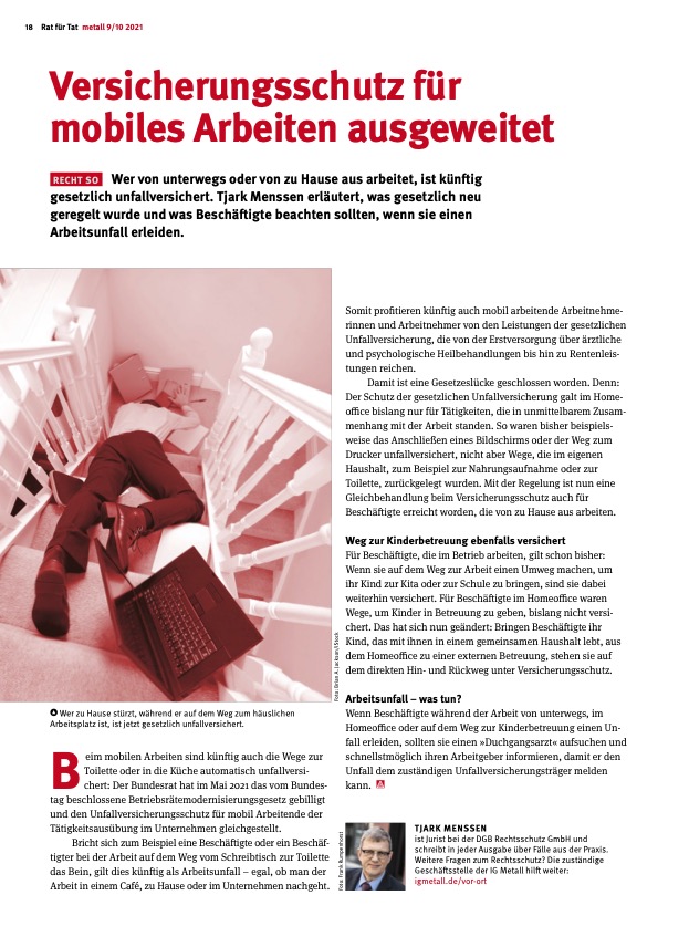 In der Ausgabe 9/10 2021 metall, Mitgliedermagazin der IG Metall analysiert Tjark Menssen (Jurist bei der DBG Rechtsschutz GmbH) die neue Lage.