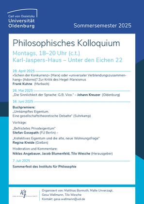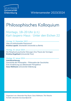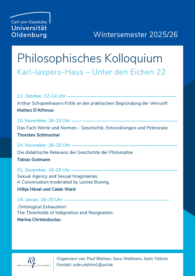 Das Philosophische Kolloquium dient dem philosophischen Gedankenaustausch über klassische Themen und gegenwartsbezogene Fragen der Philosophie. Auswärtige Gäste stellen dafür ihre aktuellen Forschungen kritisch zur Diskussion. Zudem berichten Oldenburger Dozent*innen und Nachwuchswissenschaftler*innen über ihre Forschungsarbeit, die somit über den Universitätsalltag hinaus kennengelernt werden kann. Ein Teil der Vortragsthemen ist in den Kontext einiger Lehrveranstaltungen eingebettet, die so durch andere Sichtweisen bereichert werden. Zu den Vorträgen und Diskussionen sind Dozent*innen, Studierende und die städtische Öffentlichkeit herzlich willkommen.