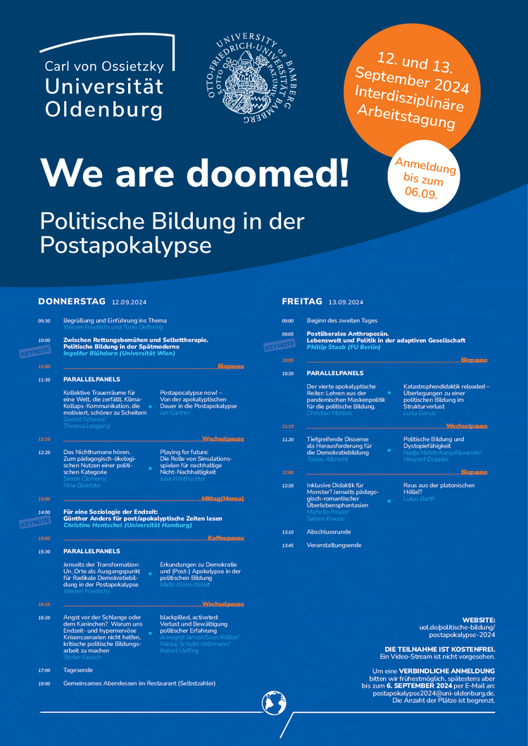 | 15:30 | Jenseits der Transformation: Un_Orte als Ausgangspunkt für Radikale Demokratiebildung in der Postapokalypse Werner Friedrichs | Erkundungen zu Demokratie und (Post-) Apokalypse in der politischen Bildung Malte Kleinschmidt |