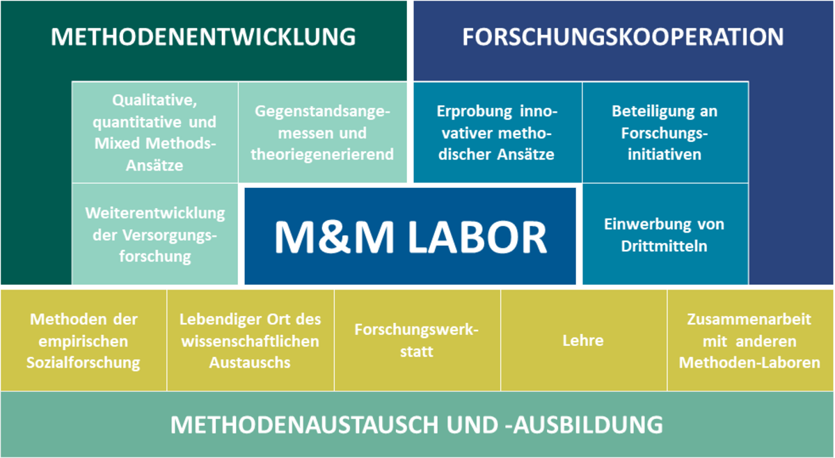 - Methodenentwicklung: Das M&M-Labor setzt sich im Sinne einer gegenstandsangemessenen und theoriegenerierenden Versorgungsforschung für die Stärkung und Weiterentwicklung von qualitativen, quantitativen und Mixed Methods-Ansätzen ein.