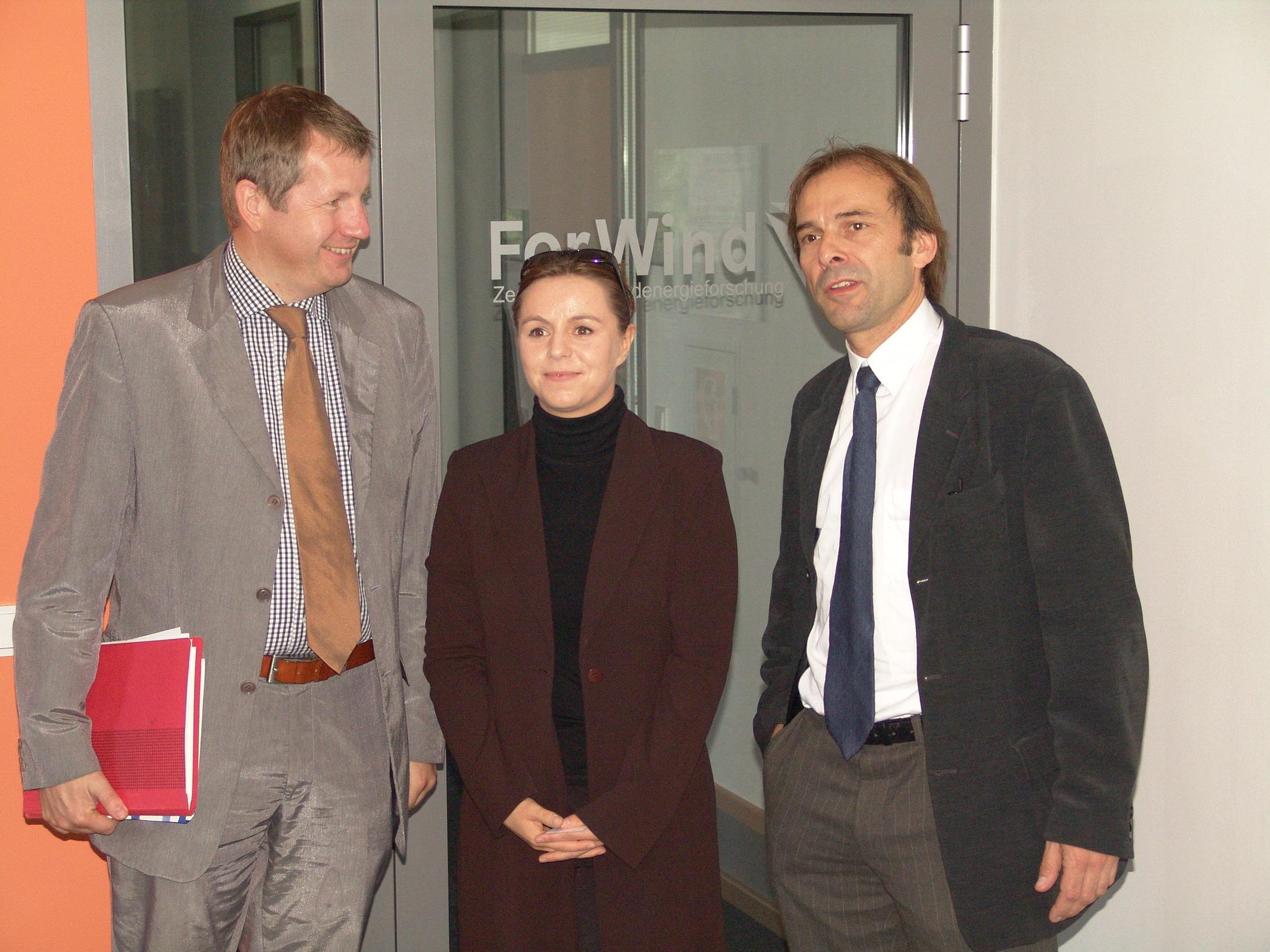 Stratmann informierte sich über die Arbeitsschwerpunkte von ForWind, die durch den erwarteten Übergang zur Offshore-Windenergienutzung und durch die Integration der Windenergie in die Stromnetze geprägt sind. Diese Bereiche werden künftig wesentliche Standbeine der Windenergieindustrie sein. „Mit ForWind in Oldenburg und dem Deutschen Windenergie-Institut (DEWI) in Wilhelmshaven und Cuxhaven ist Niedersachsen hervorragend positioniert und wird der weiteren Entwicklung in der Windenergie wichtige Impulse geben“, erklärte Wissenschaftsminister Stratmann.