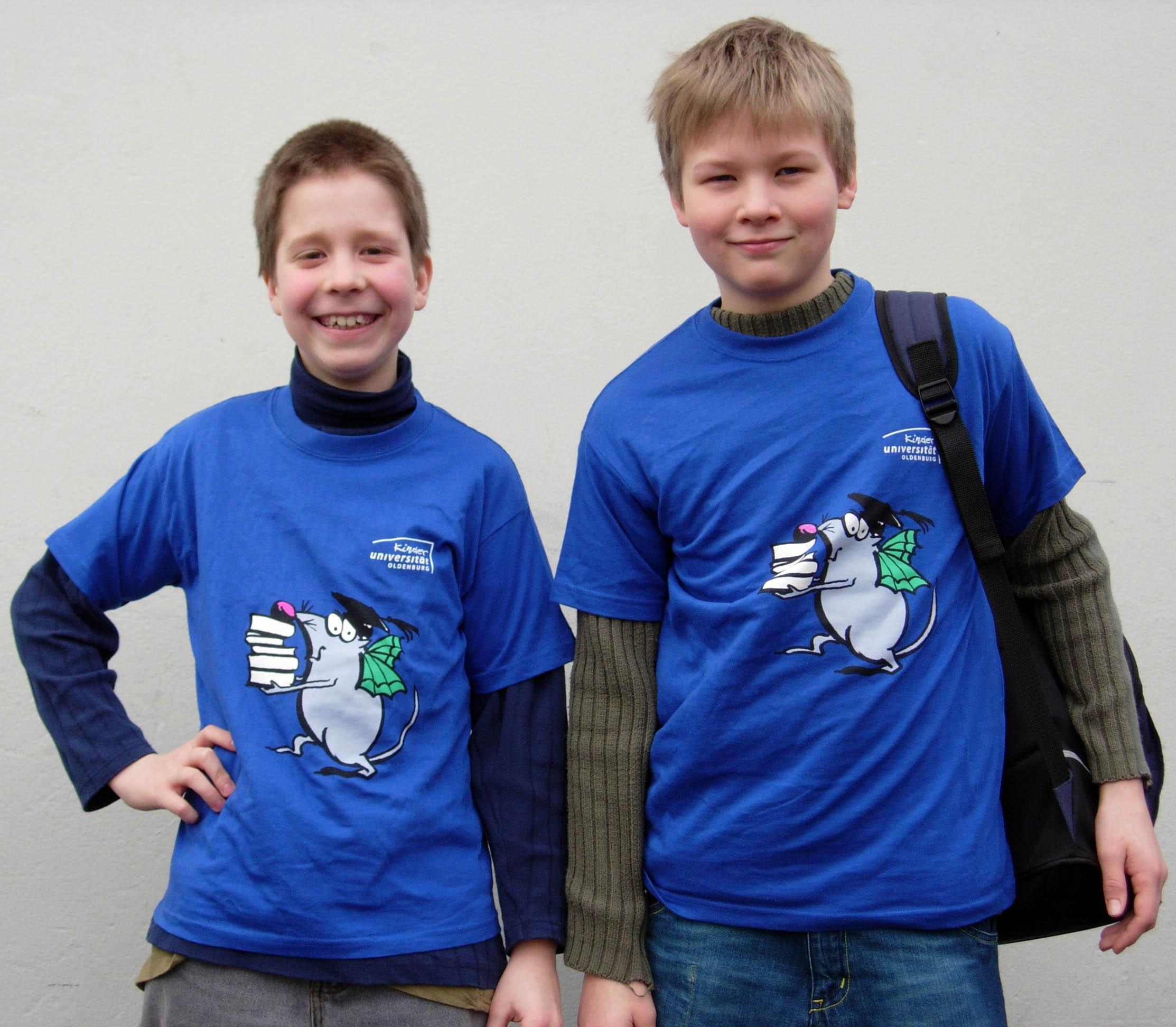 Für die Fans der KinderUniversität Oldenburg bieten die Organisatoren nun auch auf vielfachen Wunsch von Kindern und Eltern das KinderUni-T-Shirt mit Kuni, der fliegenden Leseratte, an. Das blaue Shirt ist jeweils zu den Vorlesungen im Hörsaalfoyer erhältlich.