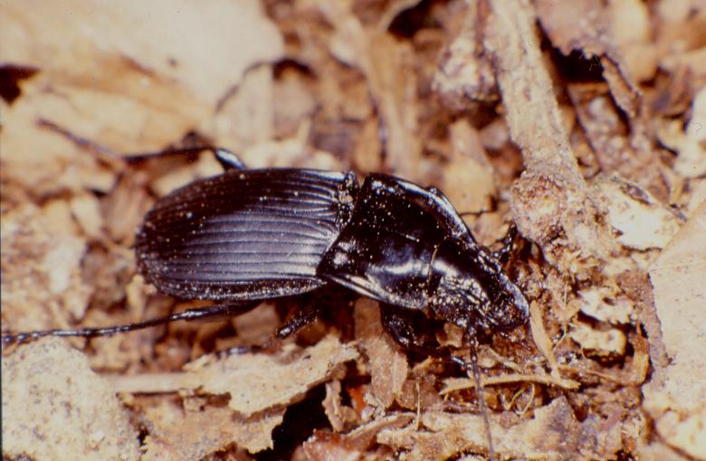 Fotounterschrift: Der Große Breitkäfer, Abax parallelepipedus, gehört zu den häufigsten Laufkäfern in den historisch alten Wäldern der Region (Foto: O.-D. Finch).