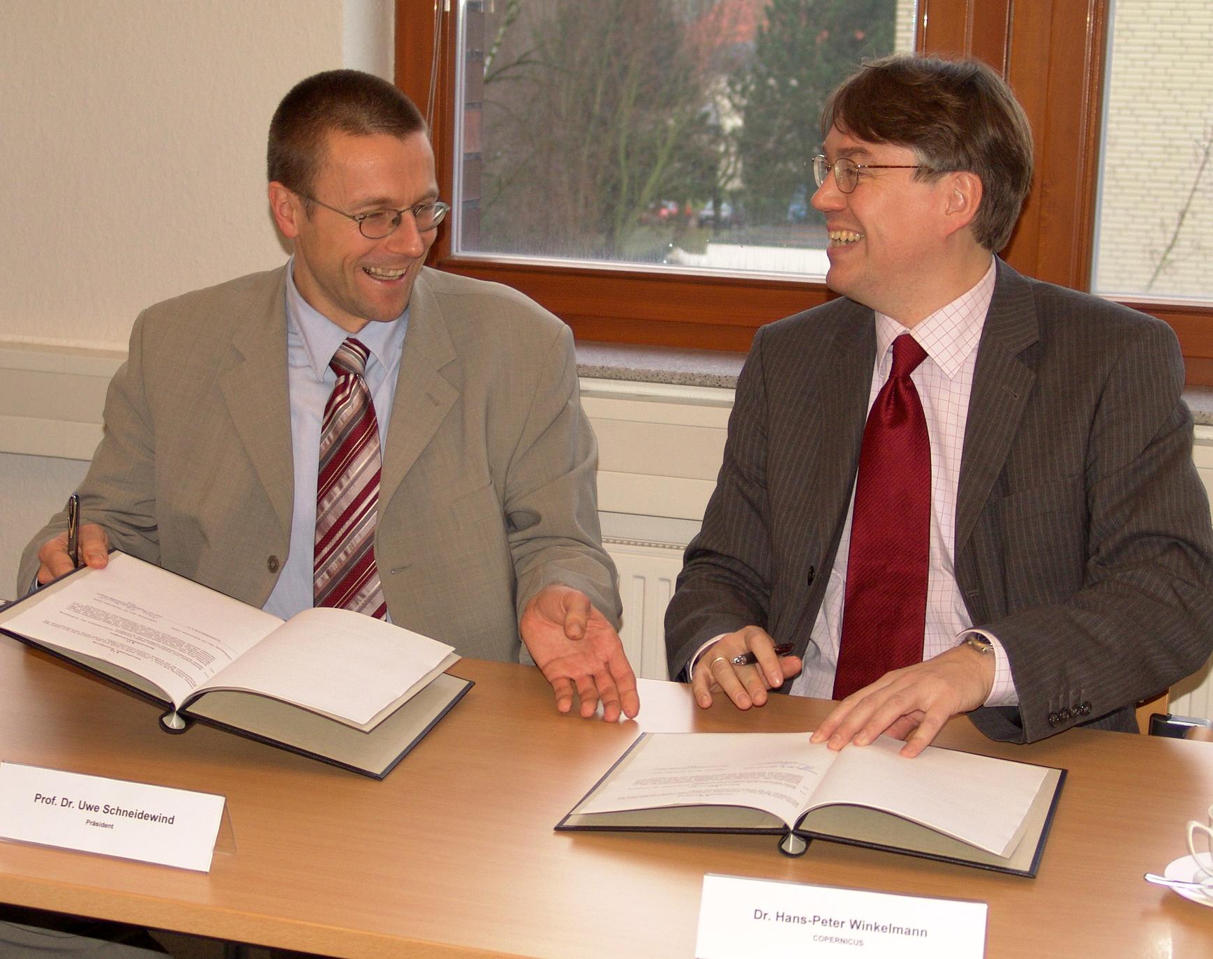 Universitätspräsident Prof. Dr. Schneidewind bewertete die COPERNICUS-Verlegung nach Oldenburg als Ausdruck für die auch international hohe Anerkennung der Umwelt- und Nachhaltigkeitsforschung der Universität Oldenburg, die tiefe Spuren auch in der Lehre hinterlasse. Der Vorstandsvorsitzende von COPERNICUS, Dr. Hans-Peter Winkelmann, betonte, er freue sich, dass es durch die Kooperation mit der Universität Oldenburg gelungen sei, COPERNICUS mittelfristig am Hochschulstandort Deutschland zu halten. Die Universität Oldenburg erscheine ihm der geeignete Partner, um zukünftig die enge Zusammenarbeit innovations- und reformfreudiger Hochschulen auf der europäischen Ebene weiter voranzubringen.