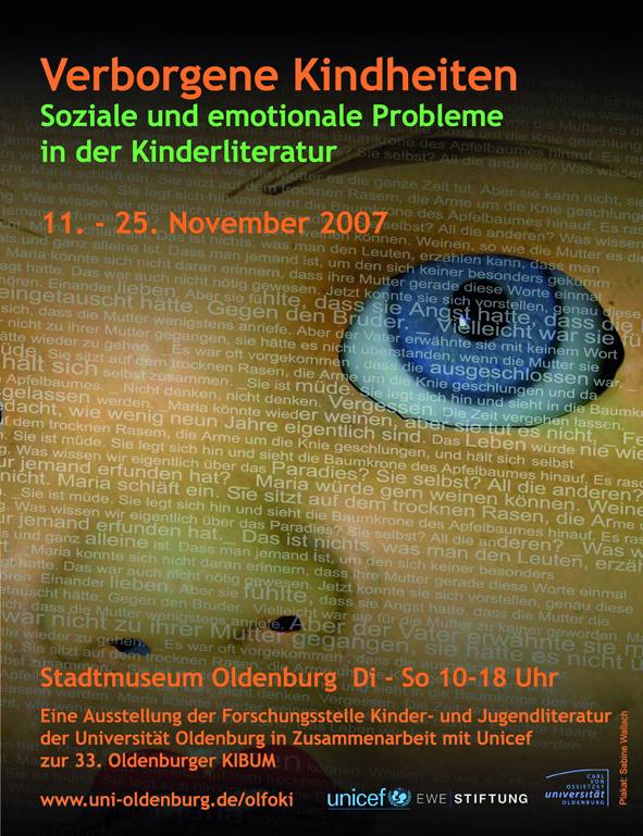 Oldenburg. Die Begleitausstellung im Rahmen der diesjährigen Kinder- und Jugendbuchmesse KIBUM mit dem Thema „Verborgene Kindheiten – Emotionale und soziale Probleme in der Kinderliteratur“ wird Sonntag, 11. November 2007, 11.15 Uhr, im Stadtmuseum Oldenburg eröffnet. Zur Eröffnung wird Reinhard Schlagintweit, ehemaliger Vorsitzender des Deutschen Komitees von UNICEF, erwartet. Prof. Dr. Jens Thiele, Direktor der Forschungsstelle Kinder- und Jugendliteratur an der Universität Oldenburg, führt in die Ausstellung ein. Anschließend liest die Schauspielerin Elfi Hoppe aus Kinderbüchern. In der Ausstellung, die vom 11. bis 26. November gezeigt wird, geht es um die literarische Beschreibung von Defiziten in der kindlichen Sozialisation: fehlende emotionale Nähe und Kontakte, mangelnde Betreuung, Einsamkeit, Ausgrenzung, Kinderarmut und Gewalt.