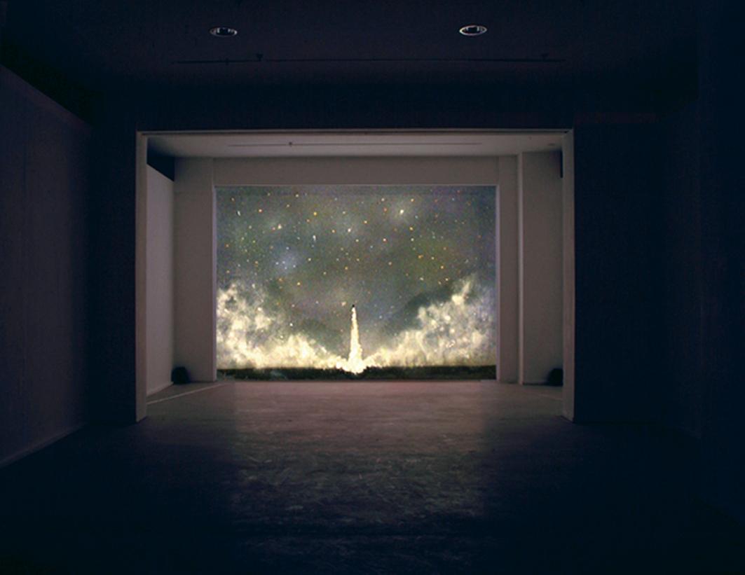 Elke Nebel (Düsseldorf) widmet sich in dem gemalten Film „Die Fährte“ dem Phänomen der Unendlichkeit, das in der zyklischen Wiederholung in kosmischer Weite erscheint.