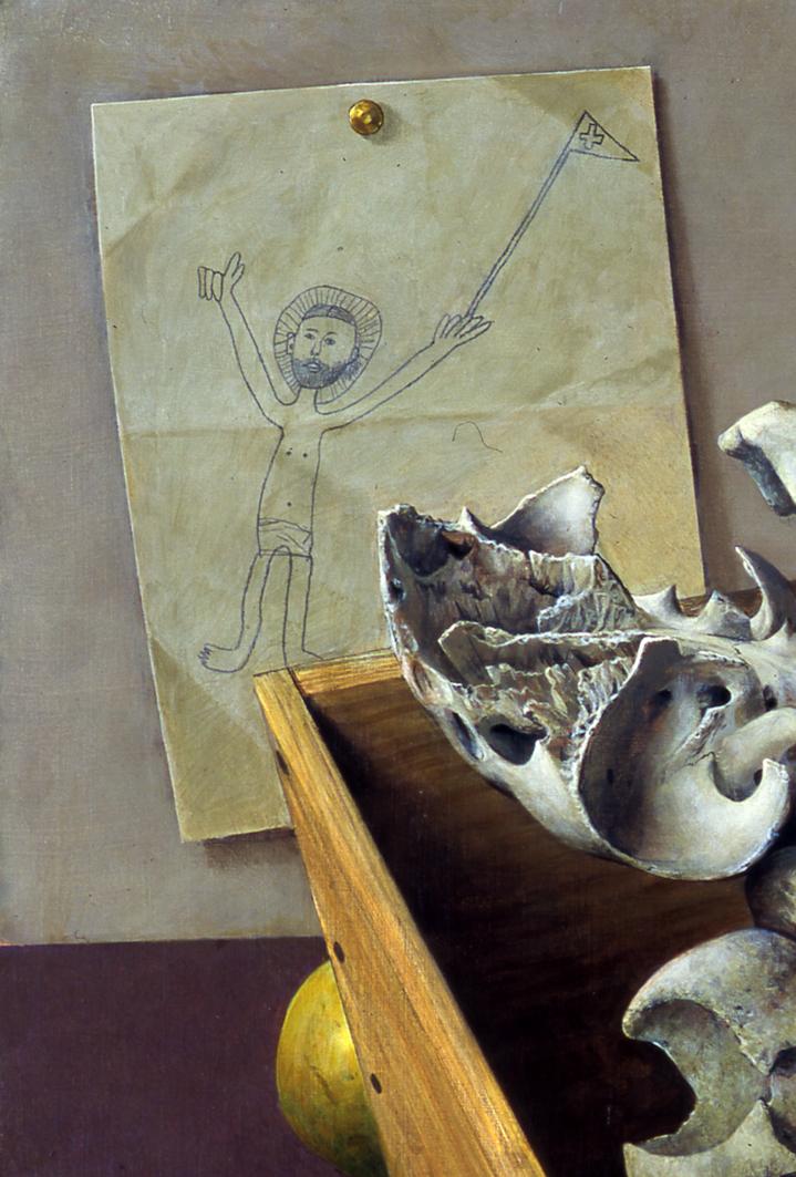 Schließlich bietet Michael Triegel (Leipzig) in altmeisterlicher Manier verschiedene Passionsmotive, die, gebrochen vom subjektiven Blick, dem säkularen Betrachter erlauben, die christliche Bildsprache neu zu lesen. „Karfreitagsstilleben“ und „Schmerzensmann“ erscheinen ungewöhnlich, die Passionsdarstellung sprengt den Rahmen der modernen Weltanschauung. Und doch verbergen und verbinden sich mit den tradierten Dogmen anthropologische Einsichten in das Leiden als unvermeidliche Größe des Lebens. Jaspers hat solcher Wirklichkeit im Begriff der „Grenzsituationen“, zu denen er Krankheit und Sterben zählt, philosophischen Ausdruck verliehen.