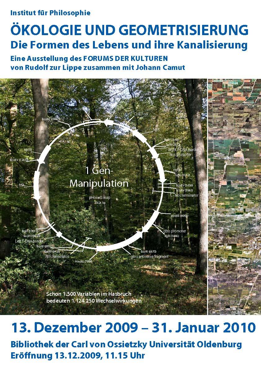 Oldenburg. Das Institut für Philosophie präsentiert in der Universitätsbibliothek Oldenburg am Uhlhornsweg vom 13. Dezember 2009 bis 31. Januar 2010 eine Ausstellung zu Evolution und Geometrisierung, die „Die Formen des Lebens und ihre Kanalisierung“ – so der Untertitel – gegenwärtig macht. Die Ausstellung wurde von Prof. Dr. Rudolf zur Lippe zusammen mit Johann Camut erarbeitet. Sie setzt sich auf vielfältige Weise mit der Kanalisierung der Natur auseinander. Geometrisierung steht in der Ausstellung für Raster und Zentralperspektive, Planierung, Fragmentierung und Programmierung ohne Rücksicht auf die Zusammenhänge der Evolution.