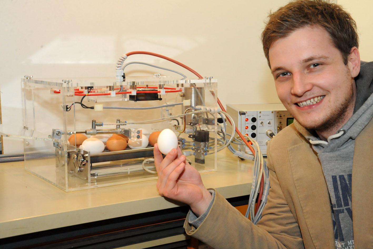Auf dem Foto: Landessieger Jannis Weihe vor seinem Gesellenstück, einem Brutautomaten für gefährdete Tierarten.