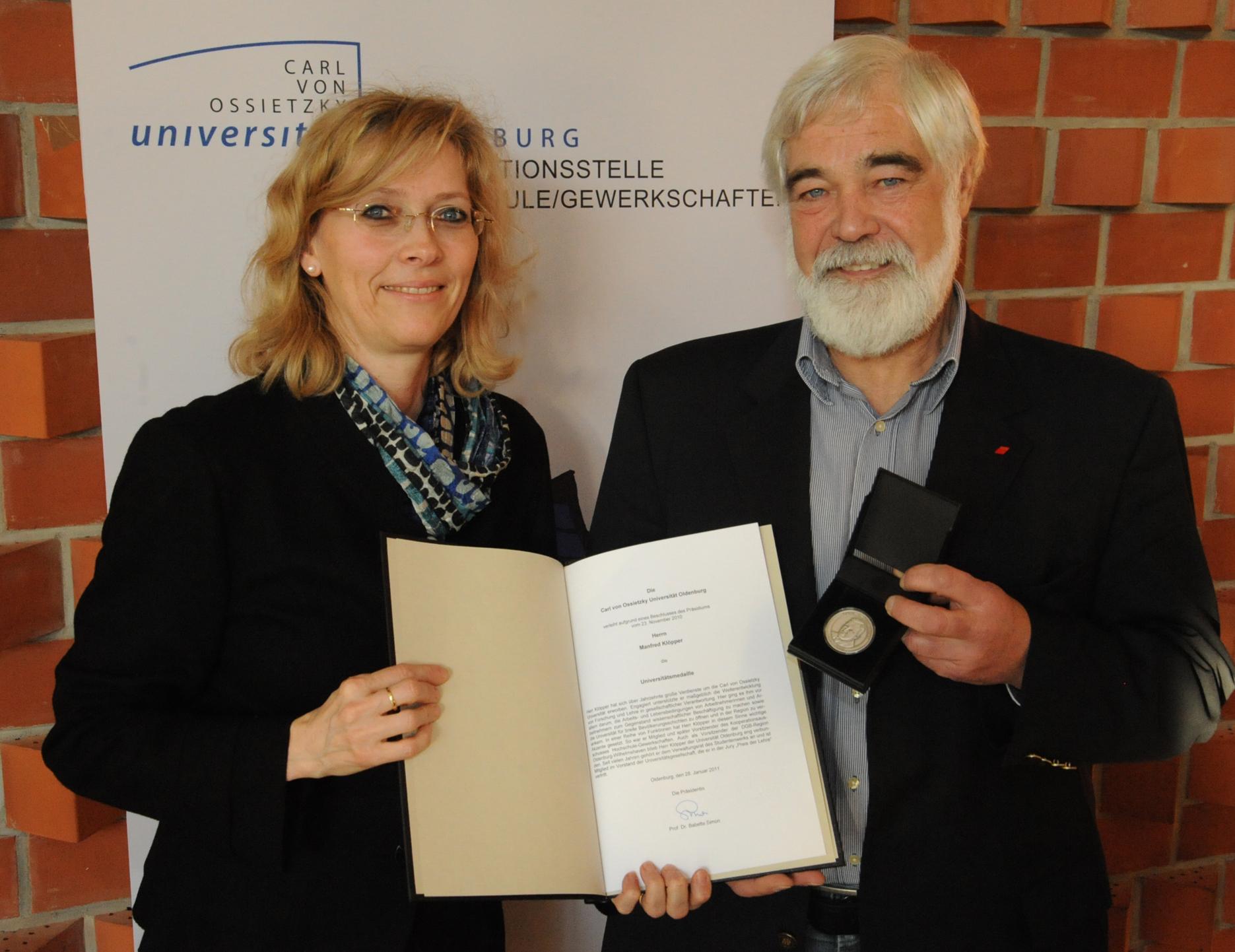 Oldenburg. Manfred Klöpper, Vorsitzender des Deutschen Gewerkschaftsbundes (DGB) in der Region Oldenburg-Wilhelmshaven, ist heute bei einer Tagung der Kooperationsstelle Hochschule-Gewerkschaften mit der Universitätsmedaille der Carl von Ossietzky Universität Oldenburg ausgezeichnet worden. Der Gewerkschafter erhält die Auszeichnung für sein Engagement bei der Weiterentwicklung von Forschung und Lehre in gesellschaftlicher Verantwortung. Universitätspräsidentin Prof. Dr. Babette Simon betonte, dass sich Klöpper als Mitglied und Vorsitzender des Kooperationsausschusses Hochschule-Gewerkschaften mit Nachdruck für die Öffnung der Hochschule für breite Bevölkerungsschichten und für die Verankerung der Universität in der Region stark gemacht habe. Auch als Regionsvorsitzender des DGB sei er der Universität Oldenburg eng verbunden geblieben. Klöpper gehört seit vielen Jahren dem Verwaltungsrat des Studentenwerks an und ist Mitglied im Vorstand der Universitätsgesellschaft Oldenburg e.V. (UGO).